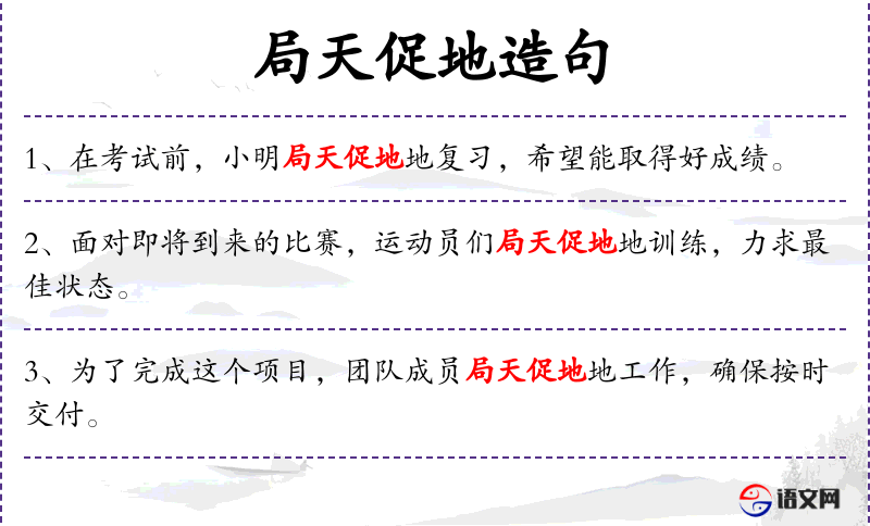 - 局天促地地:形容词,表示非常努力或急切地做某事。