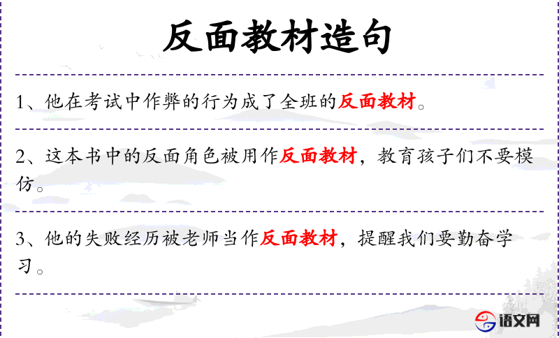 1. 【反面教材】 消极的供教学用的资料。借指坏的典型。