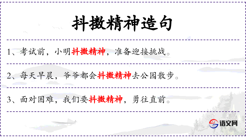 句子:“老师鼓励我们抖擞精神,认真学*每一课。”