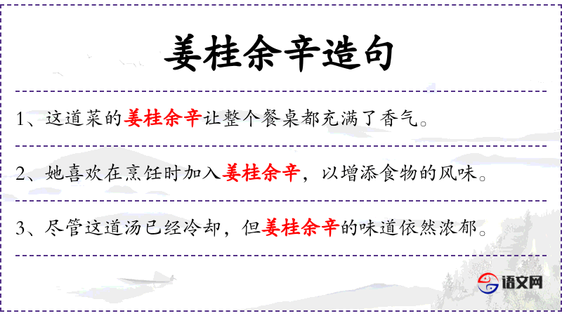 句子:“厨师巧妙地运用姜桂余辛,使得这道菜的味道层次分明。”