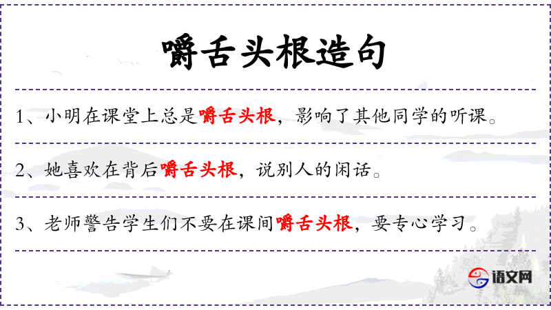 - 嚼舌头根:成语,比喻背后说人坏话。