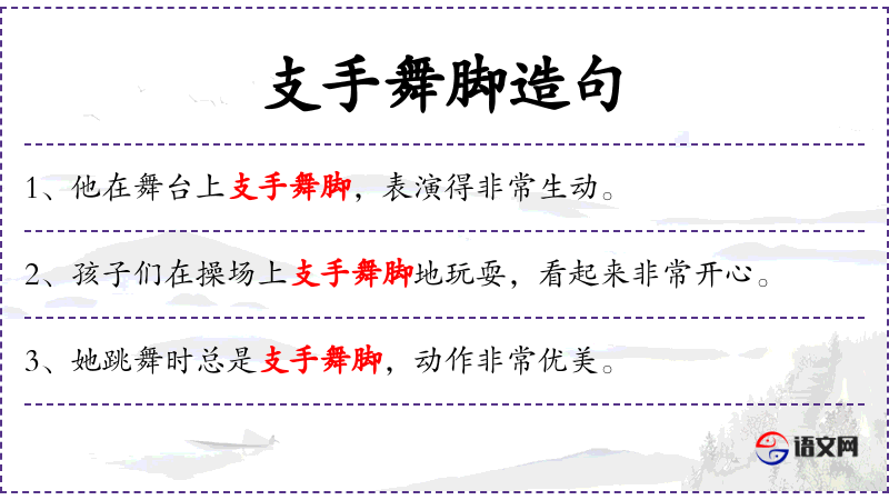 - “支手舞脚”这个表达可能源自**传统文化中对表演艺术的描述,强调动作的生动和夸张。