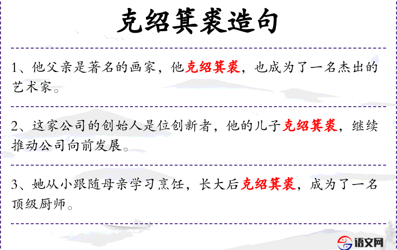 - 克绍箕裘:成语,意为继承前人的事业并发扬光大。