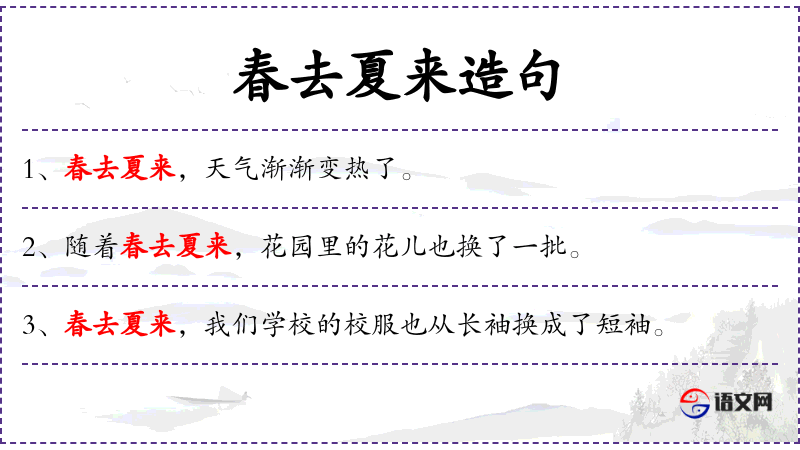 - 春去夏来:表示季节的转换,春天结束,夏天开始。