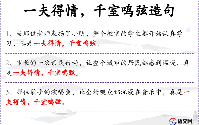 - “一夫得情,千室鸣弦”是**成语,源自《左传·宣公十五年》,比喻一个人的情感或成就能引起广泛的共鸣。