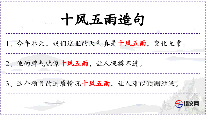 - 十风五雨:这是一个成语,原意是指风和雨很多,比喻事情变化无常,不稳定。