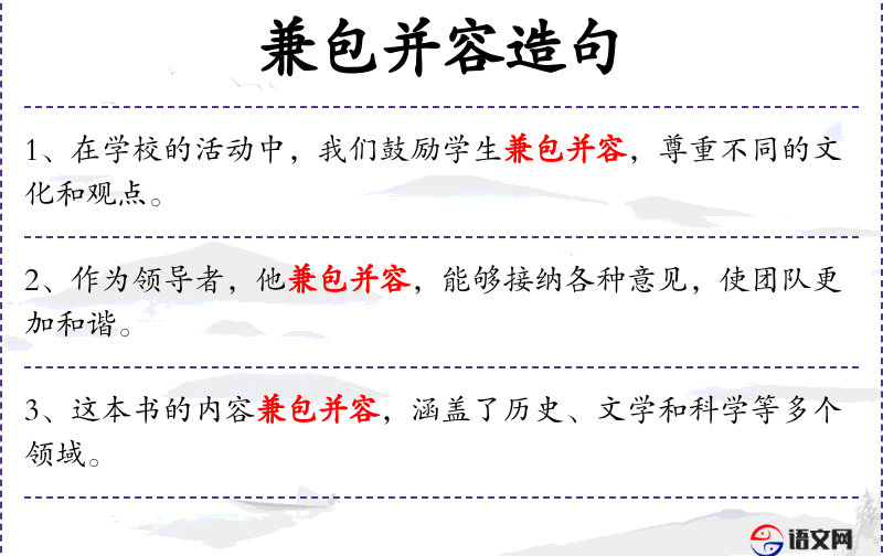 - 兼包并容:成语,意为“包容各种不同的意见和事物”。
