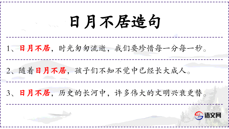 这个句子中包含了“日月不居”这个成语,反映了文化中对时间流逝的感慨。在传统文化中,时间的流逝常常被赋予深刻的意义,与人生、成长、变迁等主题紧密相关。
