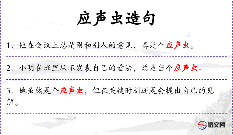 - 应声虫:这个成语在**文化中常用来批评那些没有主见、盲目附和他人的人。