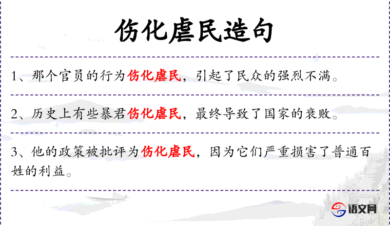 - 伤化虐民:形容词短语,指伤害和虐待民众。