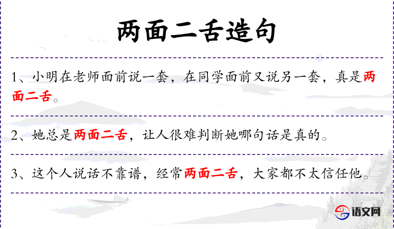 - 成语:“两面二舌”是一个成语,用来形容人言行不一。
