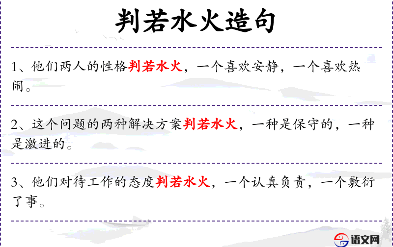 “判若水火”这个成语体现了中文中常用的比喻手法,用来强调两者之间的巨大差异。在中华文化中,认真负责被视为一种美德,而敷衍了事则被认为是不负责任的表现。