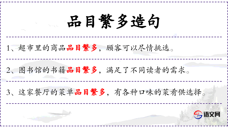 1. 【品目繁多】 品目:物品的名目、种类,也作等第讲。名目种类很多。