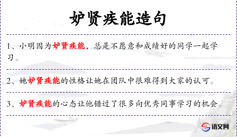 - 由于妒贤疾能的心态,他错失了许多向优秀同事学*的机会。