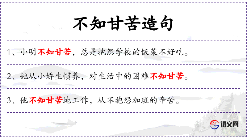 1. 【不知甘苦】 - 甘苦:甜和苦,多偏指苦。分不清是甜还是苦。形容做某事不容易或对前人的艰辛没有体会。