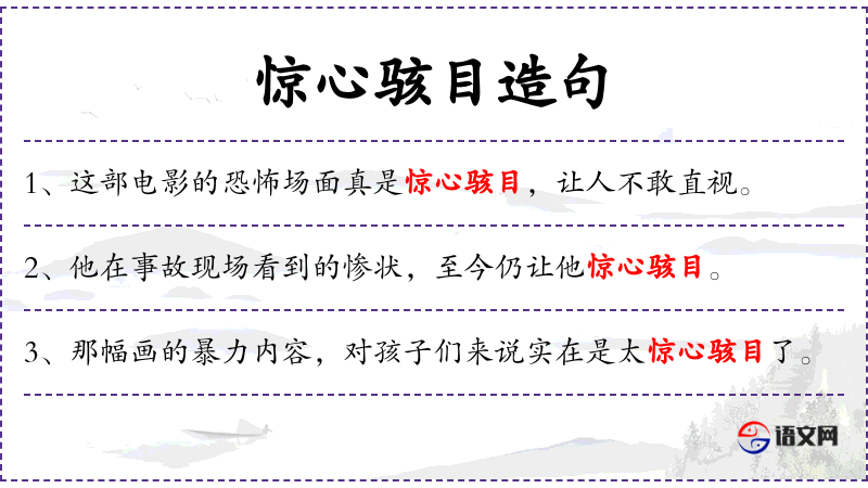 - 令人惊心骇目:形容非常恐怖或令人震惊。
