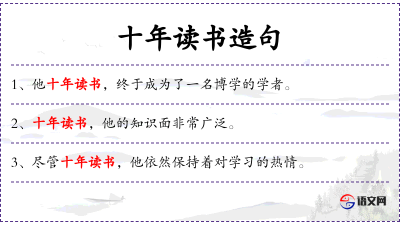 - 十年读书:表示长时间的阅读和学*。