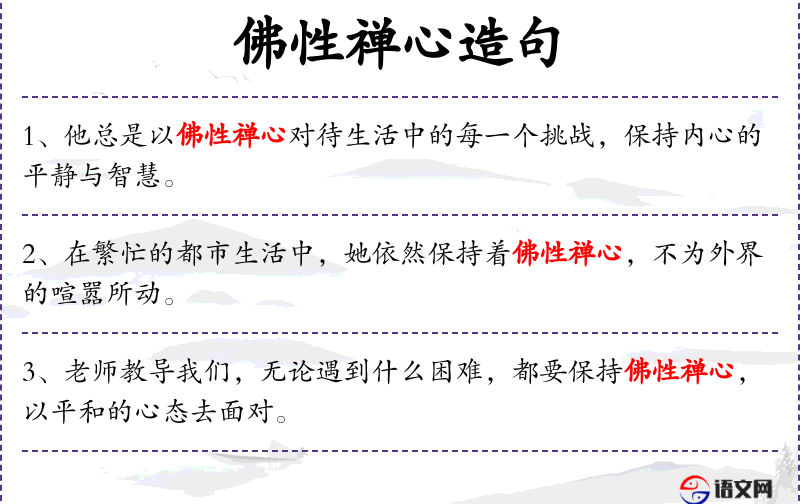 句子:“[老师教导我们,无论遇到什么困难,都要保持佛性禅心,以平和的心态去面对。]”