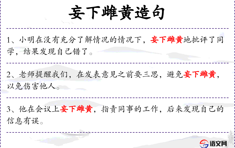 - 礼貌用语:在实际交流中,应避免使用“妄下雌黄”这样的贬义词,可以用更中性的表达如“轻率”或“不经思考”