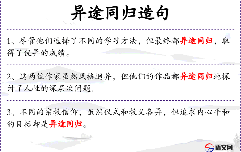 - 异途同归:比喻采取不同的方法而得到相同的结果。