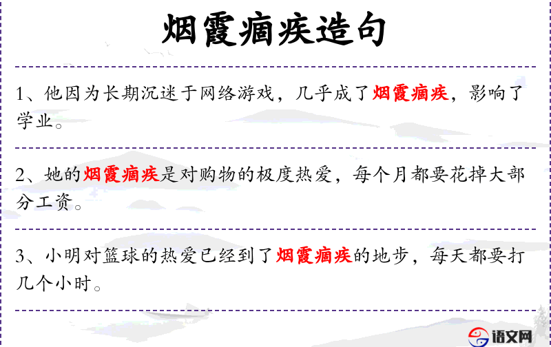 1. 【烟霞痼疾】 烟霞:指山水;痼疾:久治不愈的病,比喻积久成习,不易改变的嗜好、习惯。指爱好山水成癖。