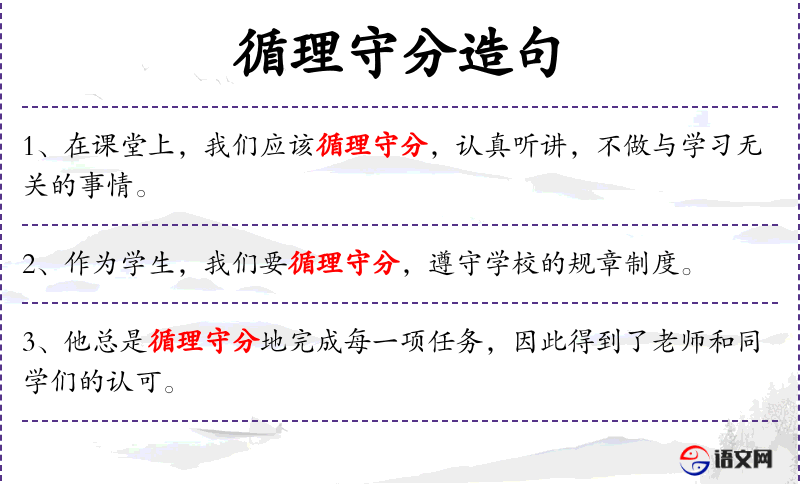 句子:“在课堂上,我们应该循理守分,认真听讲,不做与学*无关的事情。”