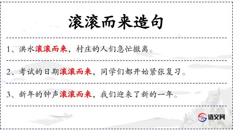 2. 【滚滚而来】 - 滚滚:指滔滔流水。形容波涛汹涌连续不断。比喻事物、言谈等连续不断。