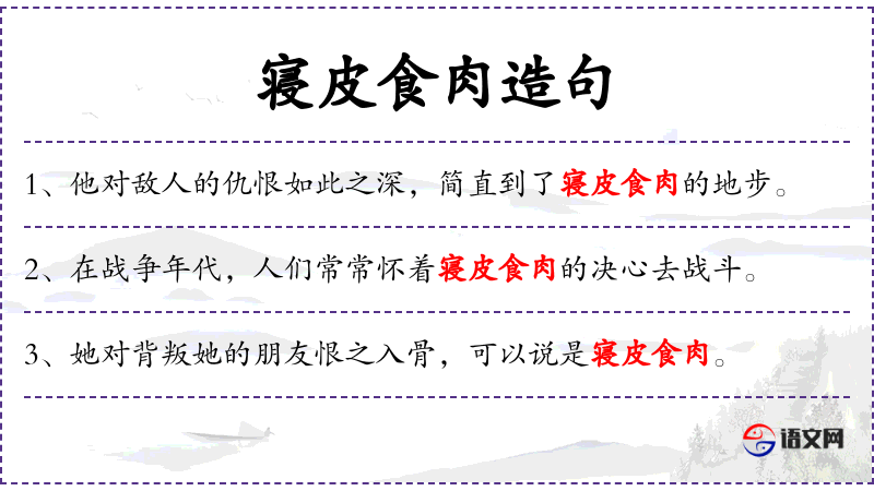 - 寝皮食肉:这个成语源自**古代,形容极端的仇恨。在现代汉语中,这种表达较为夸张,常用于文学作品或强烈的情感表达。