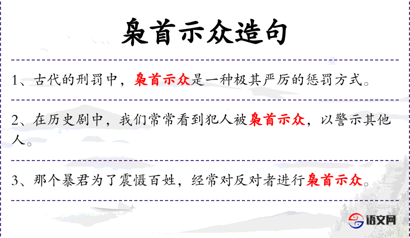 6. 【枭首示众】 旧时酷刑,把人头砍下来并高挂起来,使众人都看到。