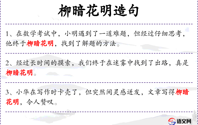3. 【柳暗花明】 - 垂柳浓密,鲜花夺目。形容柳树成荫,繁花似锦的春天景象。也比喻在困难中遇到转机。