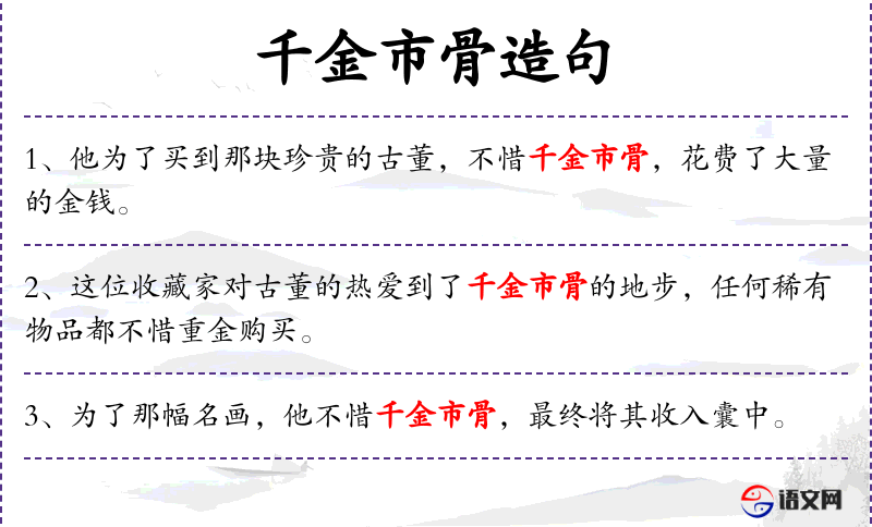 - 千金市骨:成语,比喻不惜重金购买珍贵物品。