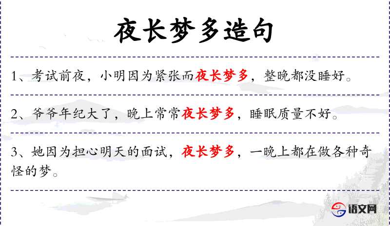 - 夜长梦多:成语,形容夜晚难以入睡,梦境纷繁。