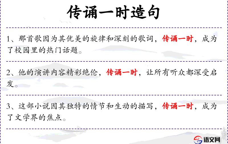 - 传诵一时:指在一段时间内广泛流传和讨论。