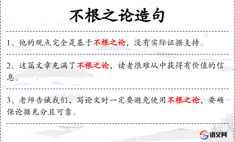 句子:“[老师告诫我们,写论文时一定要避免使用不根之论,要确保论据充分且可靠。]”