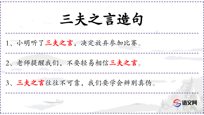 - 三夫之言:指多个人的言论,特别是指那些不负责任的言论。