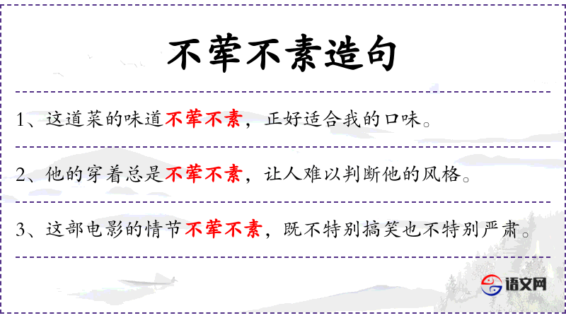 - 不荤不素:形容词短语,形容中性的、不明确的风格。