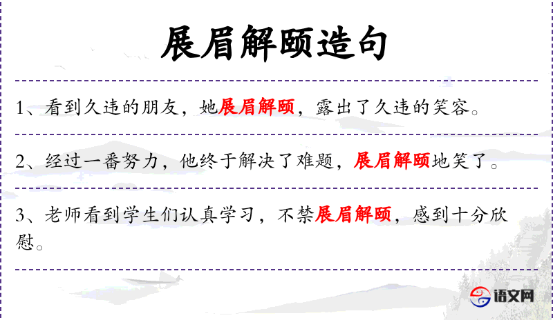 - 状语:成功地、展眉解颐地