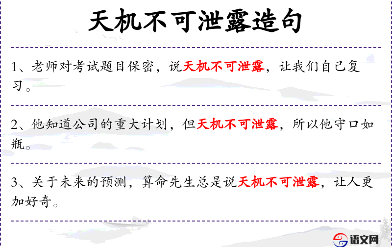- 天机不可泄露:成语,意指重要的秘密或天意不可轻易透露。