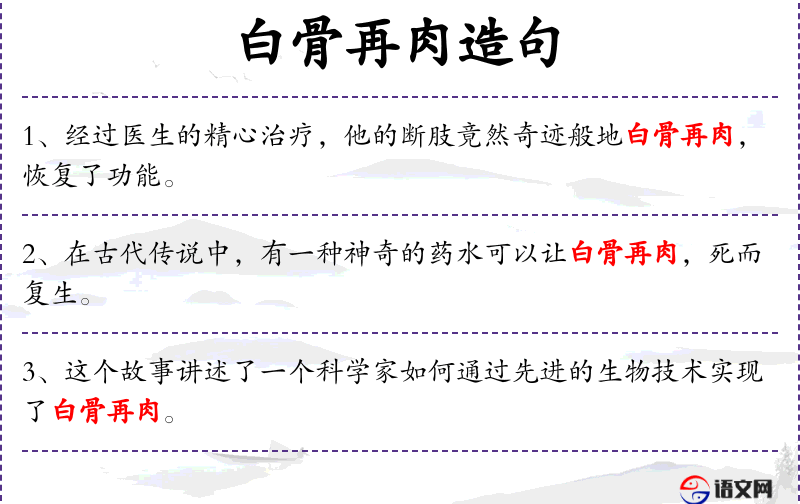 1. 【白骨再肉】 - 白骨上再生出肉来。比喻起死回生。