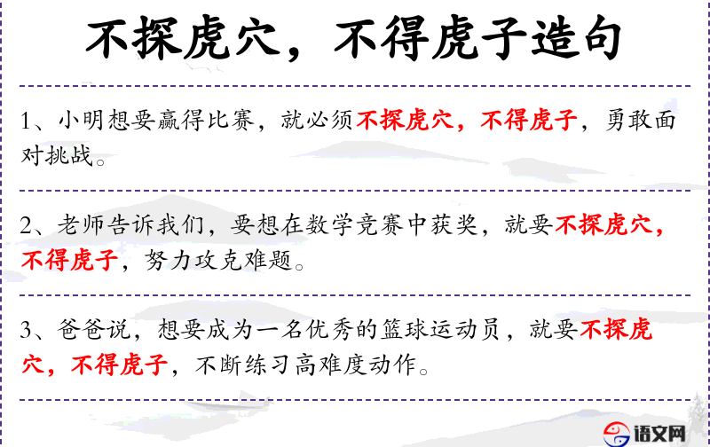 句子在教育背景下,老师在鼓励学生为了在数学竞赛中获奖而努力克服难题。文化背景中,成语“不探虎穴,不得虎子”强调了冒险和努力的重要性。