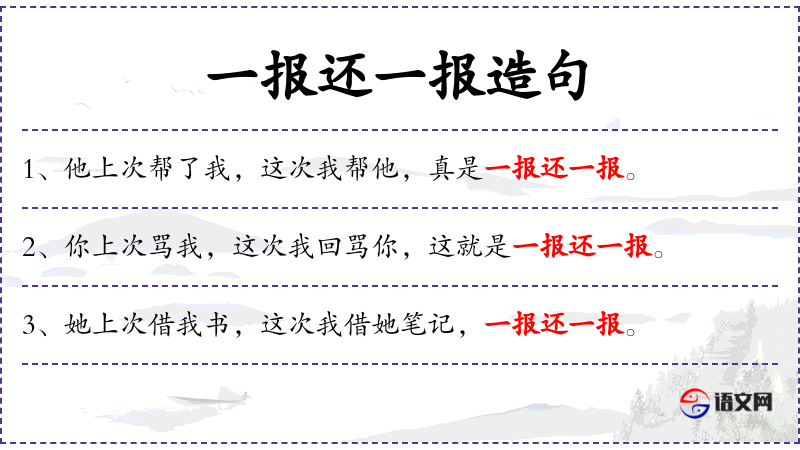 - 一报还一报:成语,表示以相同的方式回报对方的行为。
