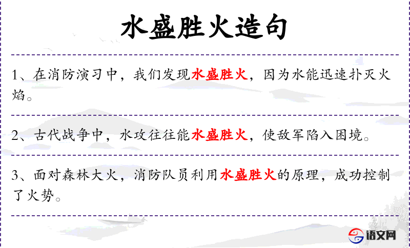 2. 【水盛胜火】 - 盛:强烈。水势盛大定能战胜火势。比喻善良终究能战胜邪恶。
