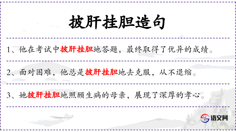 - 披肝挂胆:这个成语源自**古代,形容人非常用心、竭尽全力。