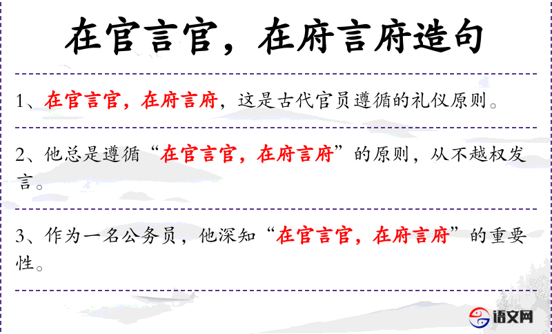 - 在官言官,在府言府:成语,意指在什么位置或环境下就应说什么样的话,遵循相应的规矩。