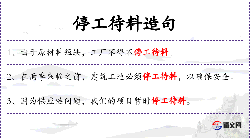 句子:“在等待新设备到货期间,生产线停工待料。”