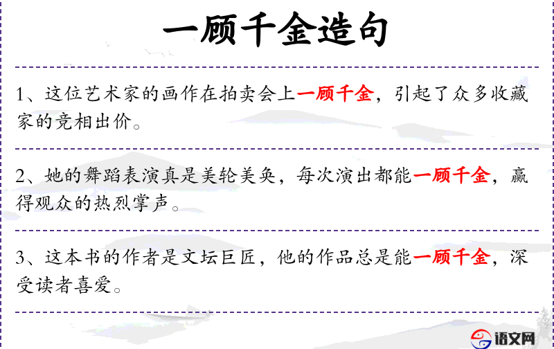 1. 【一顾千金】 - 顾:看。古之善于相马者伯乐看了马一眼,良马的身价便值千金。比喻得到贤者的推荐而使人或事物身价倍增。