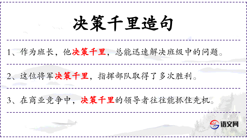 - 决策千里:形容决策的影响深远,可能源自成语“运筹帷幄之中,决胜千里之外”。