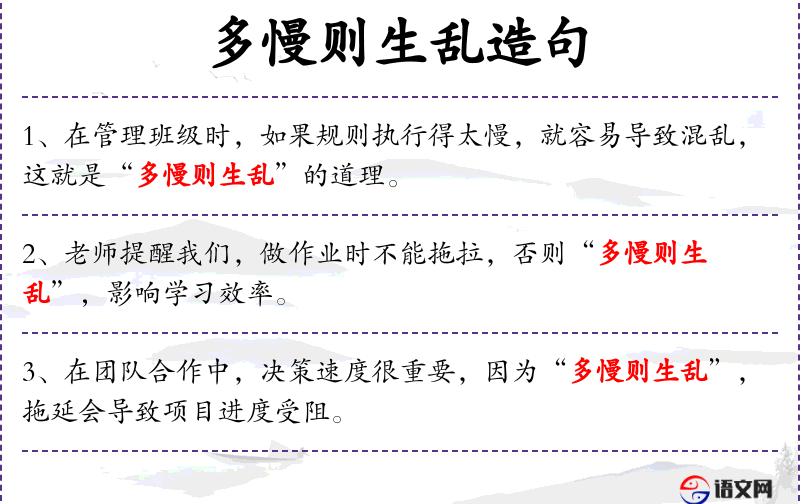 - “多慢则生乱”是一个成语,强调行动迟缓可能导致混乱。