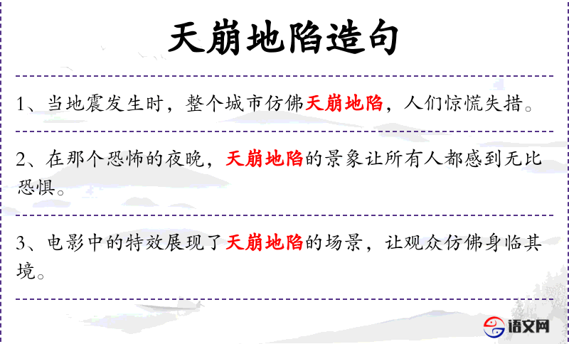 - 文化意义:“天崩地陷”这个成语在**文化中常用来形容极大的灾难或变动,反映了人们对自然灾害的敬畏和对未知的恐惧。