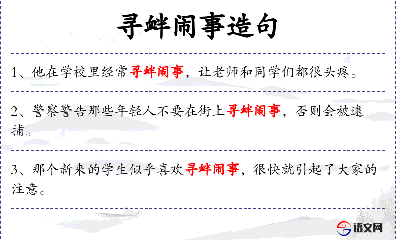 - 宾语:无直接宾语,但“寻衅闹事”可以视为谓语的间接宾语